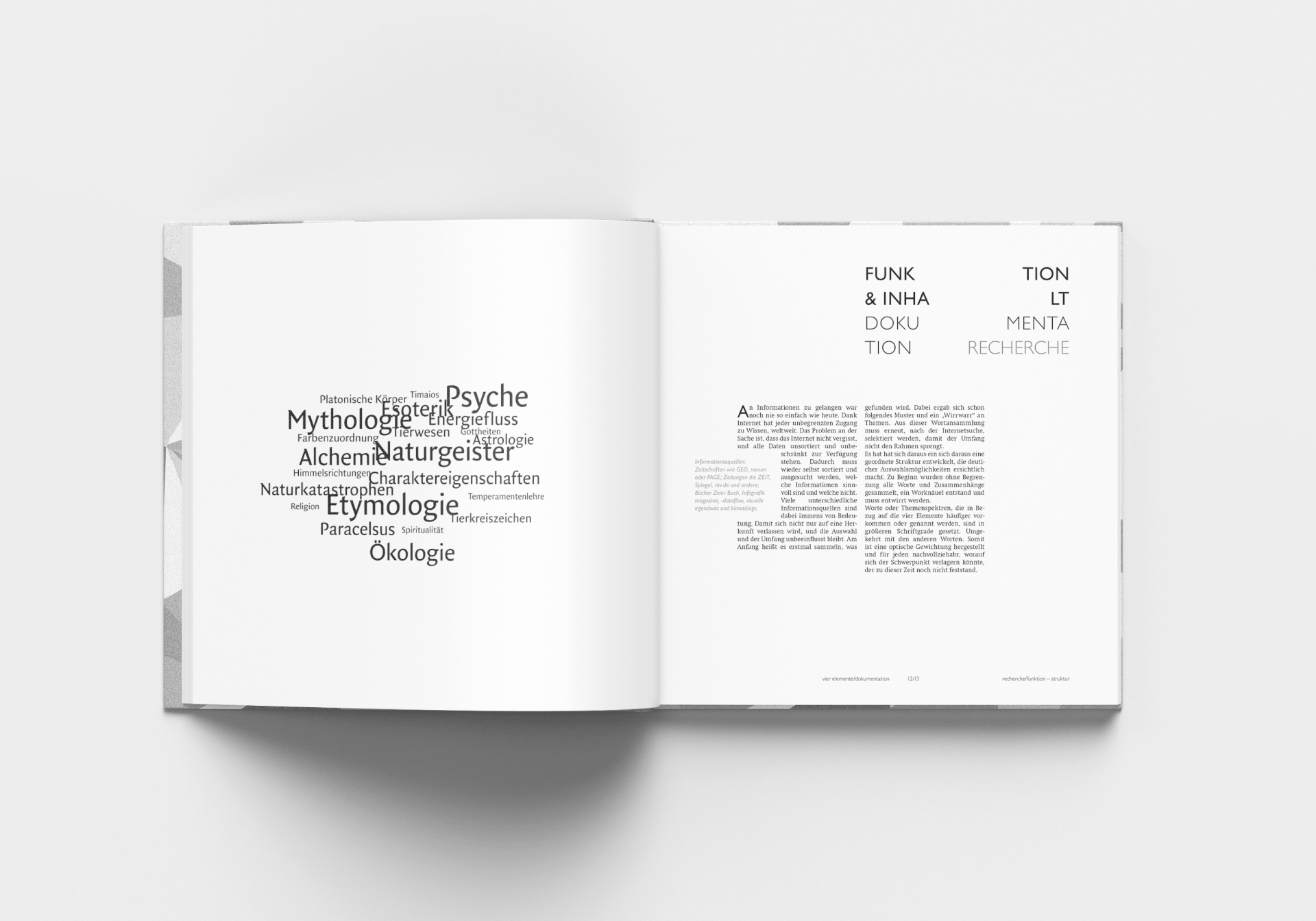 Hier wird die Dokumentation zu einem Editorialdesign-Projekt gezeigt. Es handelt sich um ein Projekt mit typografischem Schwerpunkt mit dem Thema der vier Elemente. In der Dokumentation ist die Recherche, die Entwicklung eines Logotypes, die Schrift- und Farbwahl erklärt, sowie die Bildsprache der Illustrationen aufgezeigt.