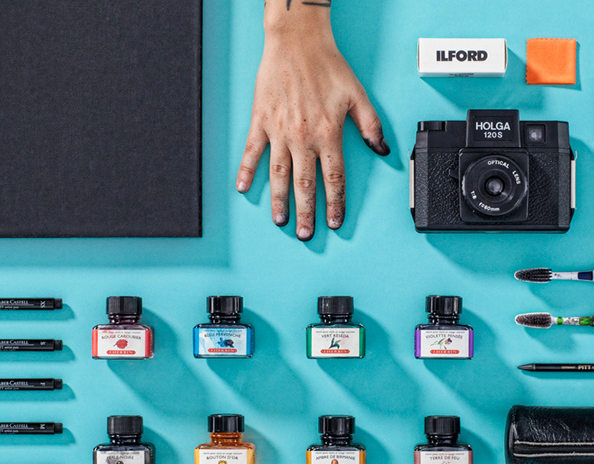 Bei KD (Abkürzung für Kommunikationsdesign) handelt es sich um ein freies Design/Photographie-Projekt. Es zeigt all die Materialien und Werkzeuge, die während eines Kommunikationsdesignstudiums verwendet werden können. Die folgenden zwei Bilder zeigen die Ausrüstung sowohl für den klassischen Tiefdruck, als auch für Linoldruck, der eine Sonderform des Hochdrucks darstellt.