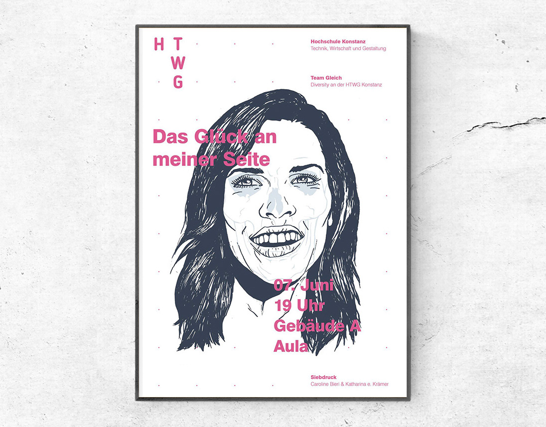 Jedes Semester wird eine Auswahl an Filmen gezeigt, die sich mit dem Thema Diversity auseinandersetzen. Dazu werden immer Filmposter benötigt, um den Abend an der Hochschule zu bewerben. Dieses Semester haben wir uns vorgenommen erstmals die Poster mittels Siebdruck herzustellen. Dazu haben wir uns individuell für jeden Film ein alternatives Motiv des üblichen Filmposters überlegt. Um das Hochschul-CI umzusetzen, arbeiteten wir zusätzlich mit selbstgemischten Druckfarben.